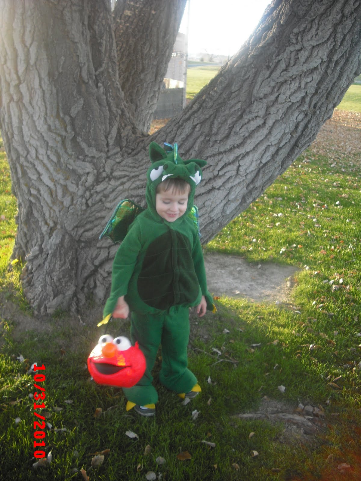 Tavis was able to carve pumpkins for the first time Grandpa Tom and Uncle T. While Tavis didn't do much of the carving himself, he took after him mom in making sure everyone did everything his way. When it came time to trick-or-treat, Tavis was a dragon, and made sure everyone knew he was going to be a GREEN dragon. He looked adorable, of course, and enjoyed seeing Corbin in his "puppy" costume.
